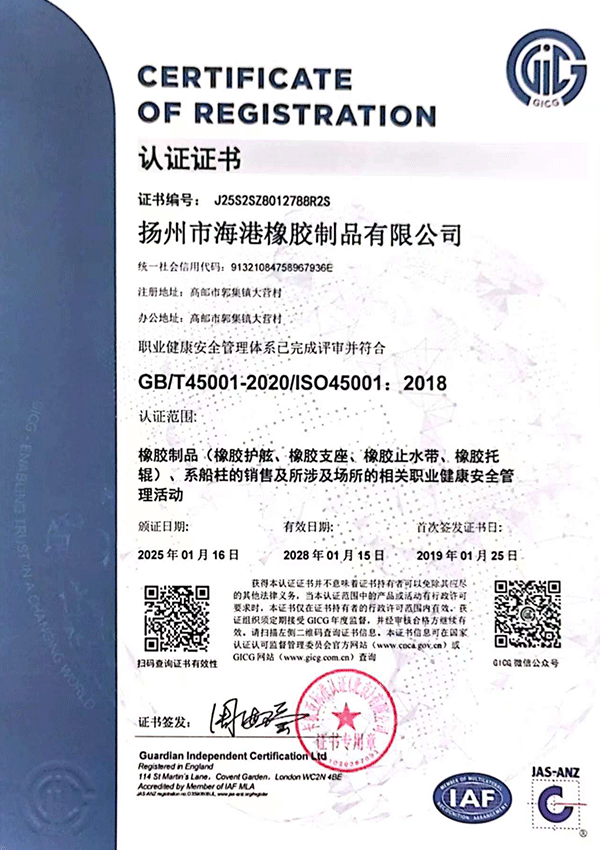 揚州市海港橡膠制品有限公司位于揚州市北郊,依傍于淮江、京滬高速公路,美麗的高郵湖緊鄰我公司,風景秀麗,水、陸暢通。我公司是專業生產橡膠制品的企業,生產近二十個系列上百種規格型號的橡膠護舷、橡膠止水帶,為滿足軍用碼頭的需要,又開發了各種規格的淺灰色橡膠護舷。擁有千萬元的生產規模,力量雄厚,檢測設備齊全。